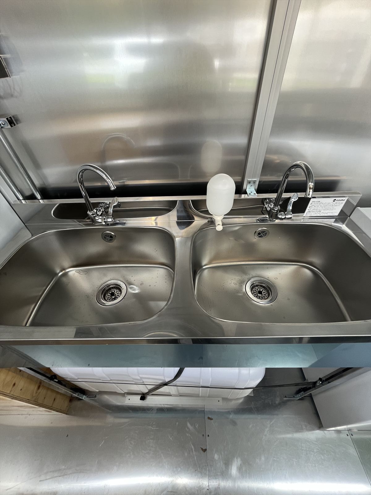 | 大型2槽シンク(レバー式蛇口付) (手洗い用液体消毒ボトル) 電動ポンプ式給排水 |