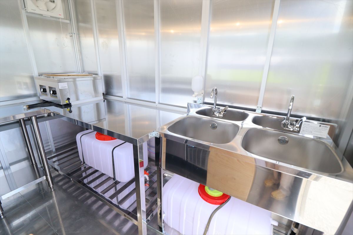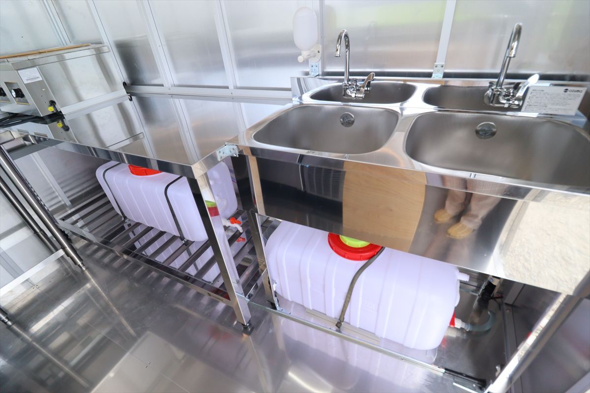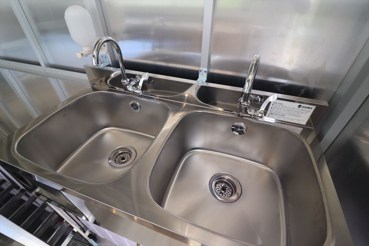 | 2槽シンク(レバー式蛇口付) (手洗い用液体消毒ボトル) 電動ポンプ式給排水 |